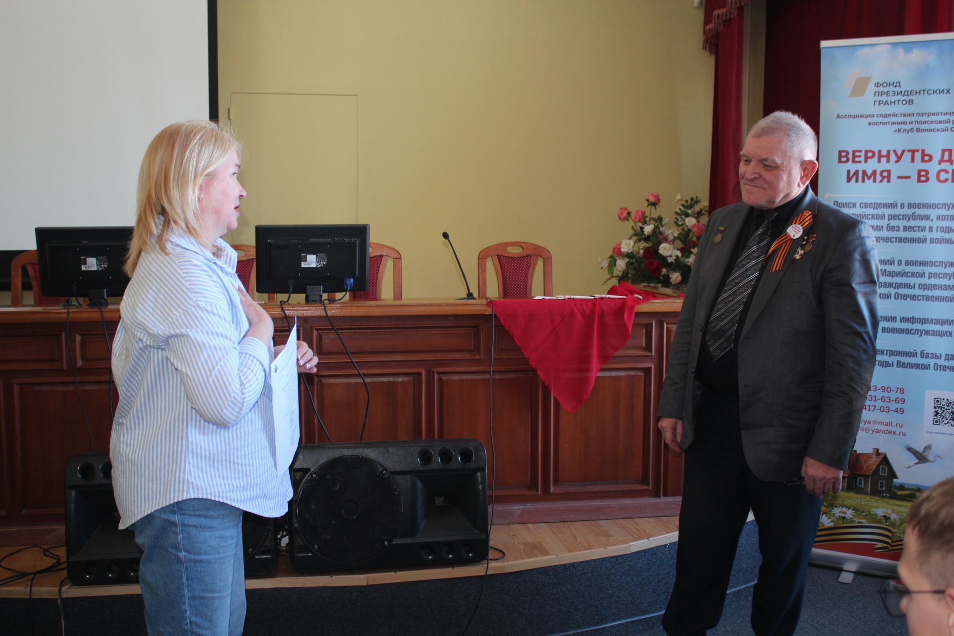 Учащиеся городских школ и члены общественных организаций района встретились с председателем Ассоциации содействия патриотическому воспитанию и поисковой работе «Клуб воинской славы» Республики Татарстан Михаилом Черепановым, председателем Региональной общественной организации Республики Марий Эл «Общество татарских краеведов», директором Ассоциации «Клуб воинской славы» Санией Газизьяновой и руководителем Нурлатского военно-патриотического клуба «Легенда» Владимиром Малыгиным.