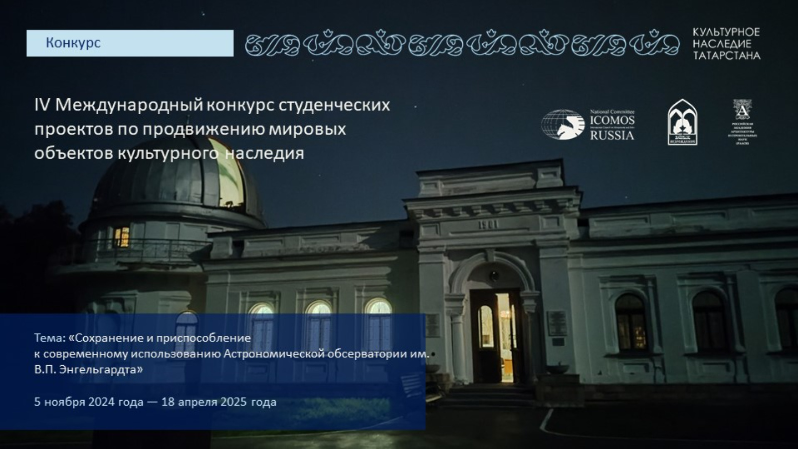 В Татарстане при поддержке Правительства республики в период с 5 ноября 2024 года по 18 апреля 2025 года проходит Международный конкурс на разработку концепции развития объекта всемирного наследия (ЮНЕСКО) «Астрономическая обсерватория В. П. Энгельгардта».