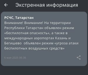 МЧС предупредило об угрозе атаки беспилотников в Татарстане с 06:36.