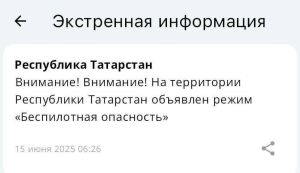 Сегодня в 6:26 по мск на территории Республики Татарстан введён режим повышенной готовности «Беспилотная опасность».