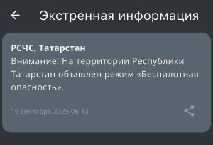 На территории Республики Татарстан с 06:43 действует режим «Беспилотная опасность».