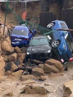 Три автомобиля провалились под землю из-за ливня на парковке в Новой Туре