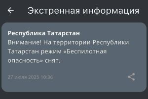 Сегодня, 27 июля, в 5:05 по московскому времени на территории Республики Татарстан вновь был введен режим «Беспилотная опасность».