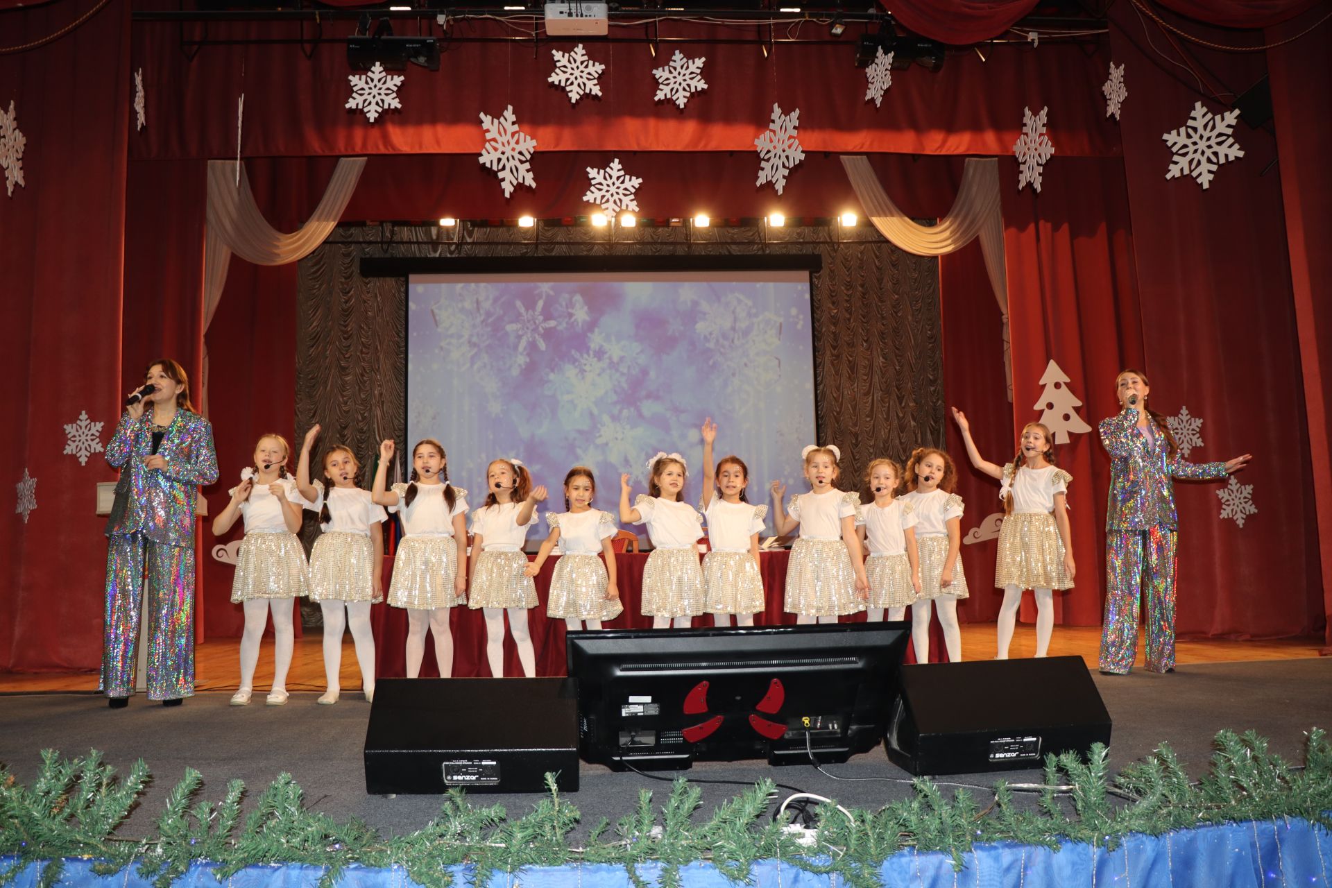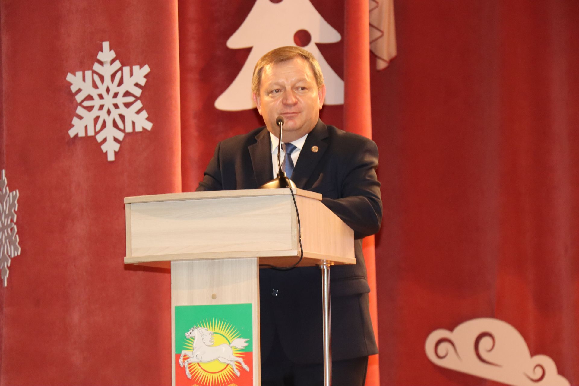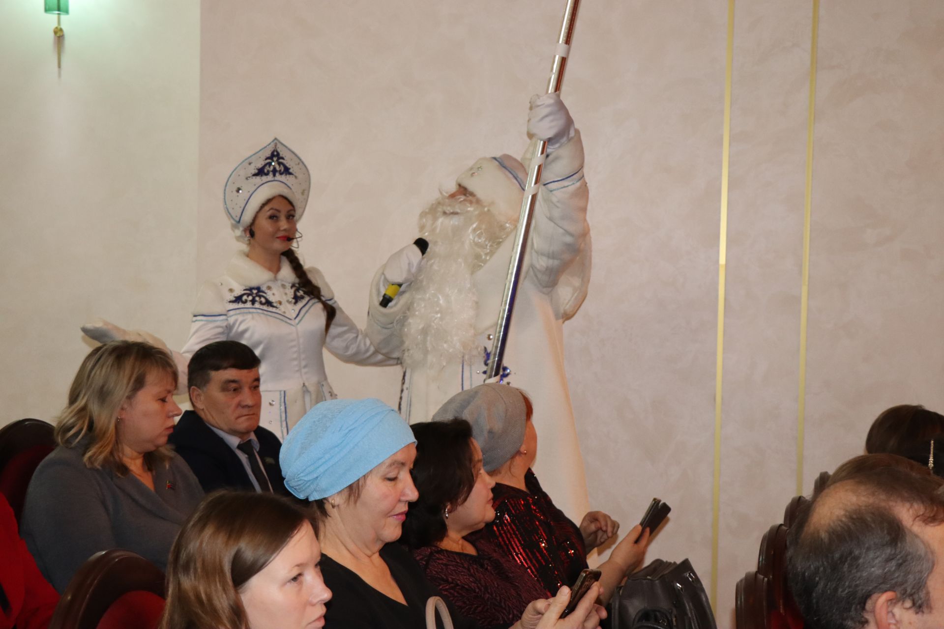 По завершению итоговой расширенной планерки на сцену Дворца культуры поднялись Дед Мороз и Снегурочка. Они поздравили всех собравшихся с наступающим Новым годом.
