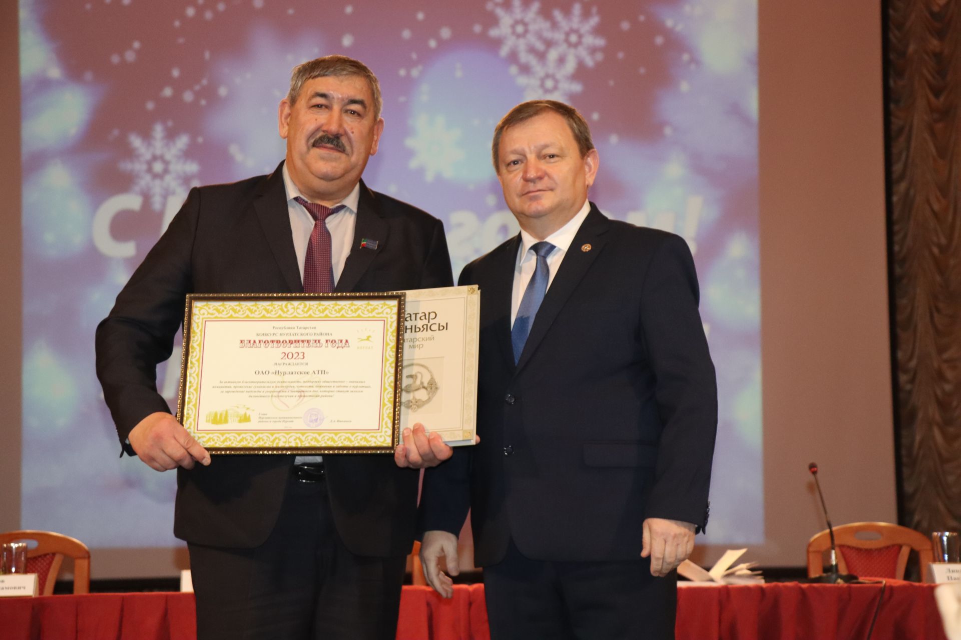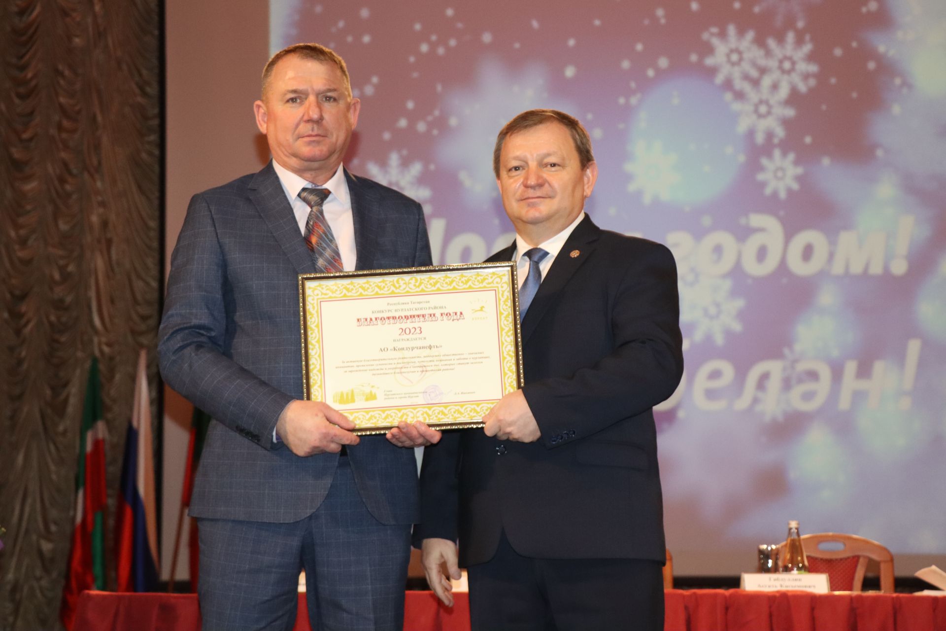 Благодарственных писем и памятных подарков в рамках конкурса «Благотворитель года-2023» удостоились руководители ПАО «Татнефть», ООО УК «Агро-Инвест», ОАО «Предприятие Кара Алтын», ООО «Карбон Ойл», АО «Кондурчанефть», АО «Татнефтепром- Зюзеевнефть», ООО «РИТЭК», АО «Татэнергосбыт», АО «Нурлатские тепловые сети», ООО «Агропорт-Халяль», АО «Татнефтеотдача», ОАО «Нурлатское АТП», УК «Татспецтранспорт», «Доктор Оптика» , ООО СК «Карат» и ООО «Промсервис».